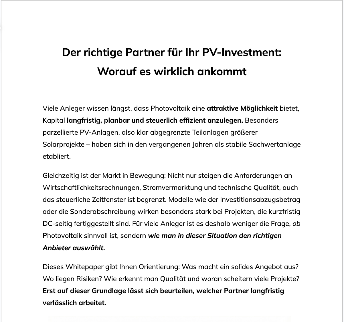 Dieses Whitepaper erklärt, worauf es bei einem zuverlässigen PV-Investment wirklich ankommt – von Qualität bis Transparenz.